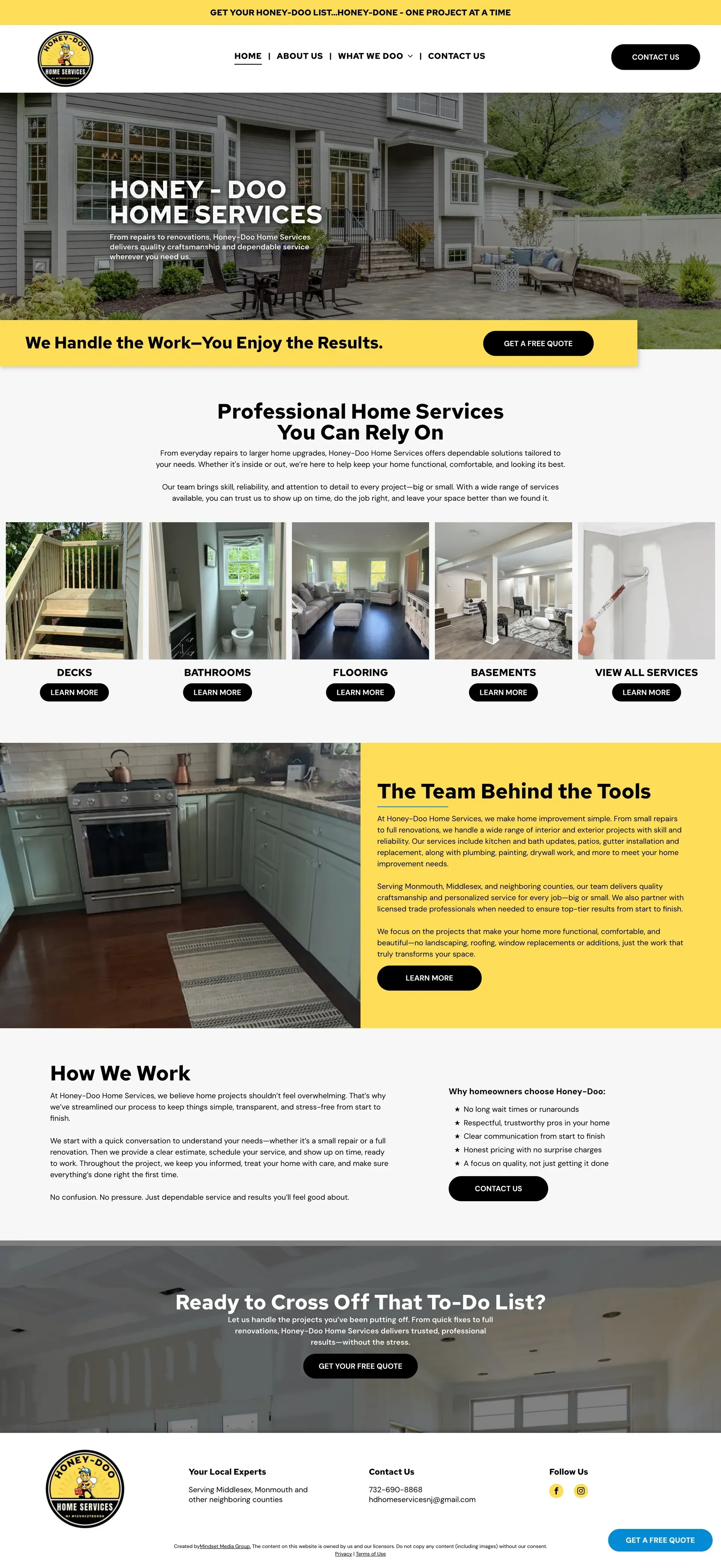 The Honey-Doo Home Services website was designed to present the company in a clean, direct, and trustworthy way while clearly outlining the range of services they provide. The layout emphasizes simple navigation and well-structured service pages, making it easy for homeowners to understand what the company offers and quickly request assistance.