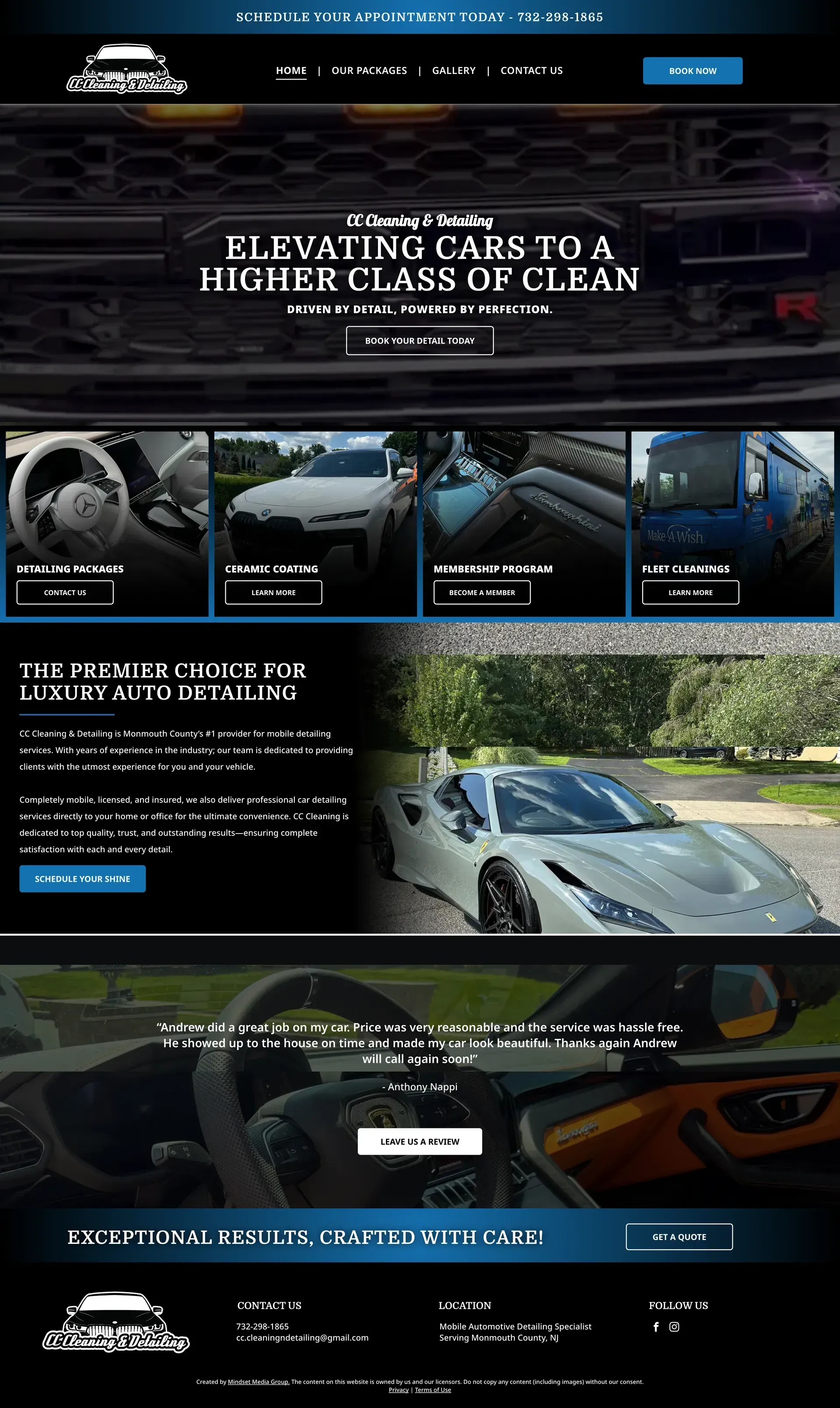 The website for CC Cleaning & Detailing was built to present the brand in a clean, modern, and professional way while making it easy for customers to explore available services. The design focuses on clearly structured service packages, allowing visitors to quickly understand detailing options and pricing.