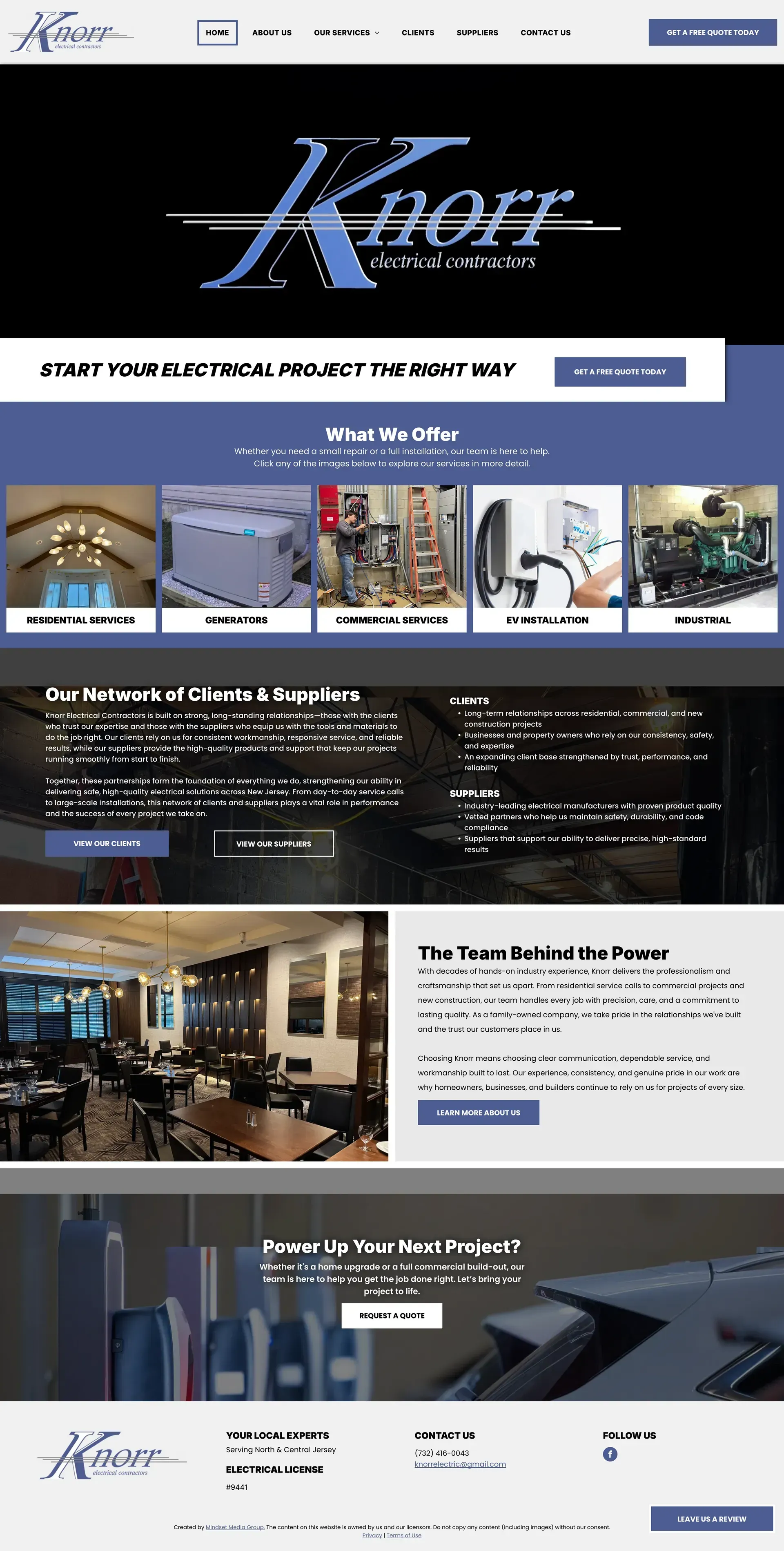 For Knorr Electrical, the goal was to position the company as experienced, dependable, and capable across residential, commercial, and industrial work. The structure of the site prioritizes clarity — guiding visitors quickly to services, suppliers, and contact information.