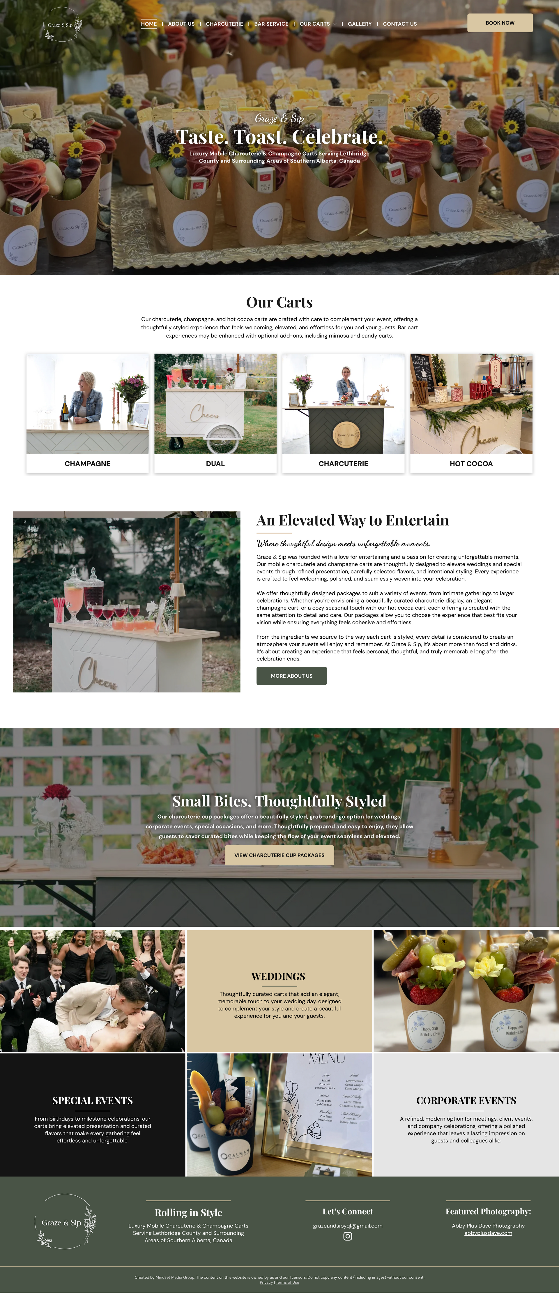 The Graze and Sip website was designed to showcase the brand’s elevated charcuterie boards and stylish bar cart services. The layout creates a warm, inviting experience while clearly presenting the range of offerings for events, from intimate gatherings to larger celebrations, including the variety of specialty carts available.
